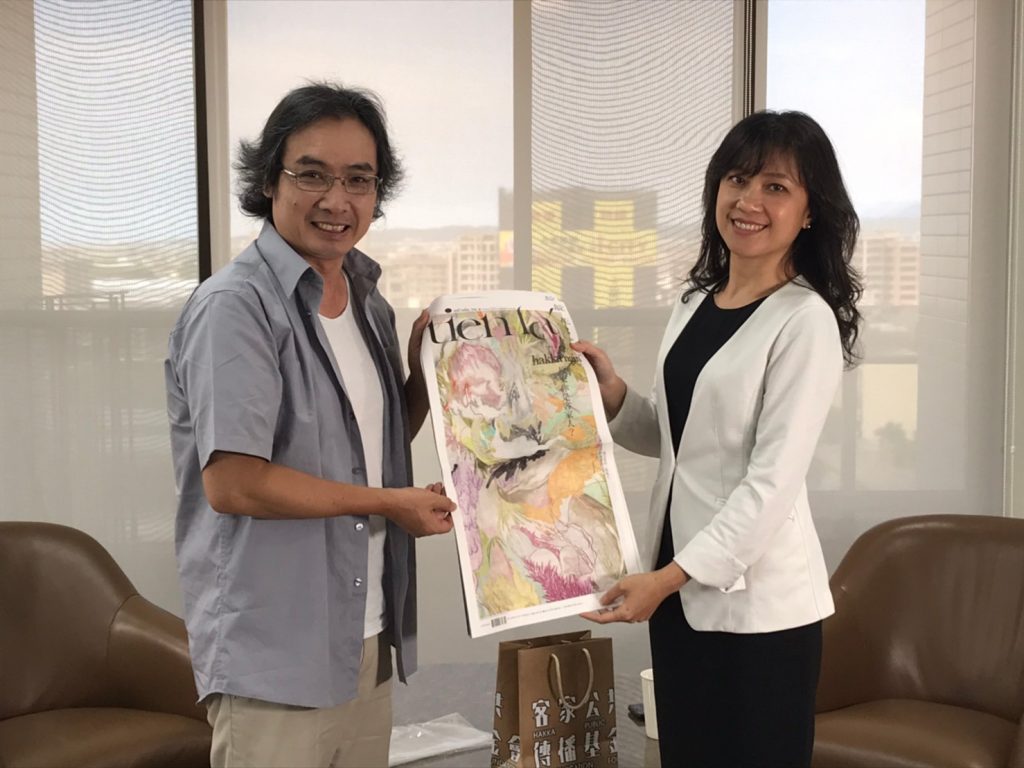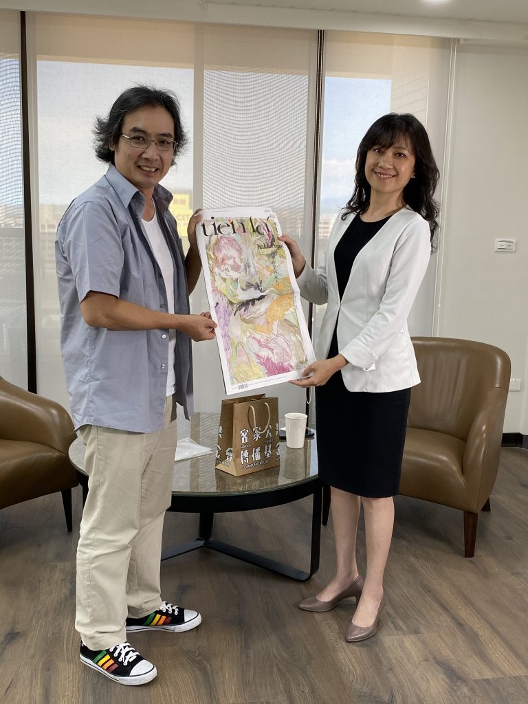 客家公共傳播基金會董事長陳邦畛與總統府發言人Kolas Yotaka共同推薦全國性客家季刊「靛花」