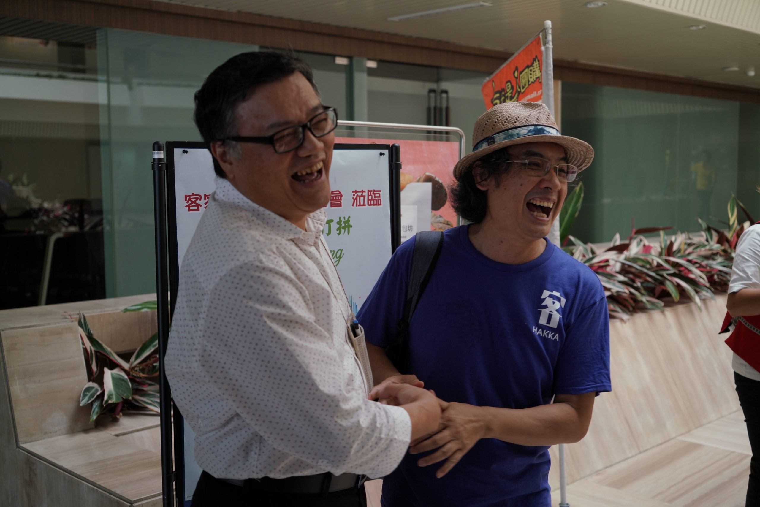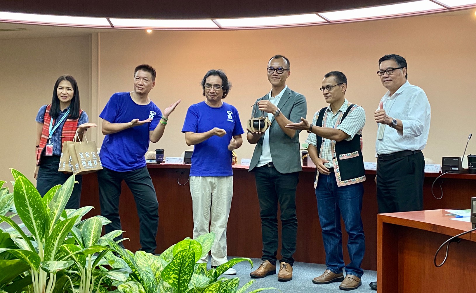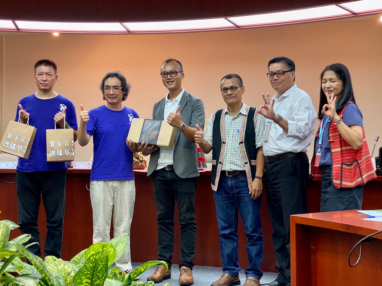 今日一早,原住民族文化事業基金會執行長Magaitan Lhkatafatu(瑪蓋丹)率領原文會所屬的原住民族電視台及Alian96.3原住民族廣播電台主管,迎接客家公共傳播基金會全體員工,雙方開心地在講客進鄉團行動直播車前高唱「客家國歌」《客家本色》,緊接著,陳董事長和執行長瑪蓋丹也互贈客家藍染、苗栗客家酸柑茶及原住民黑磁碗盤組,執行長瑪蓋丹更開玩笑地說,今天看到那麼多客家好朋友來到原文會交流,原住民耆老遇到這種熱鬧場合,都會講一個原住民式笑話,就是「今天來了那麼多朋友真是讓我「無地自容」、大家就隨興「咎由自取」吧!」語畢瞬間炒熱了現場氣氛,也讓大家見識到原住民天生熱情幽默的個性。