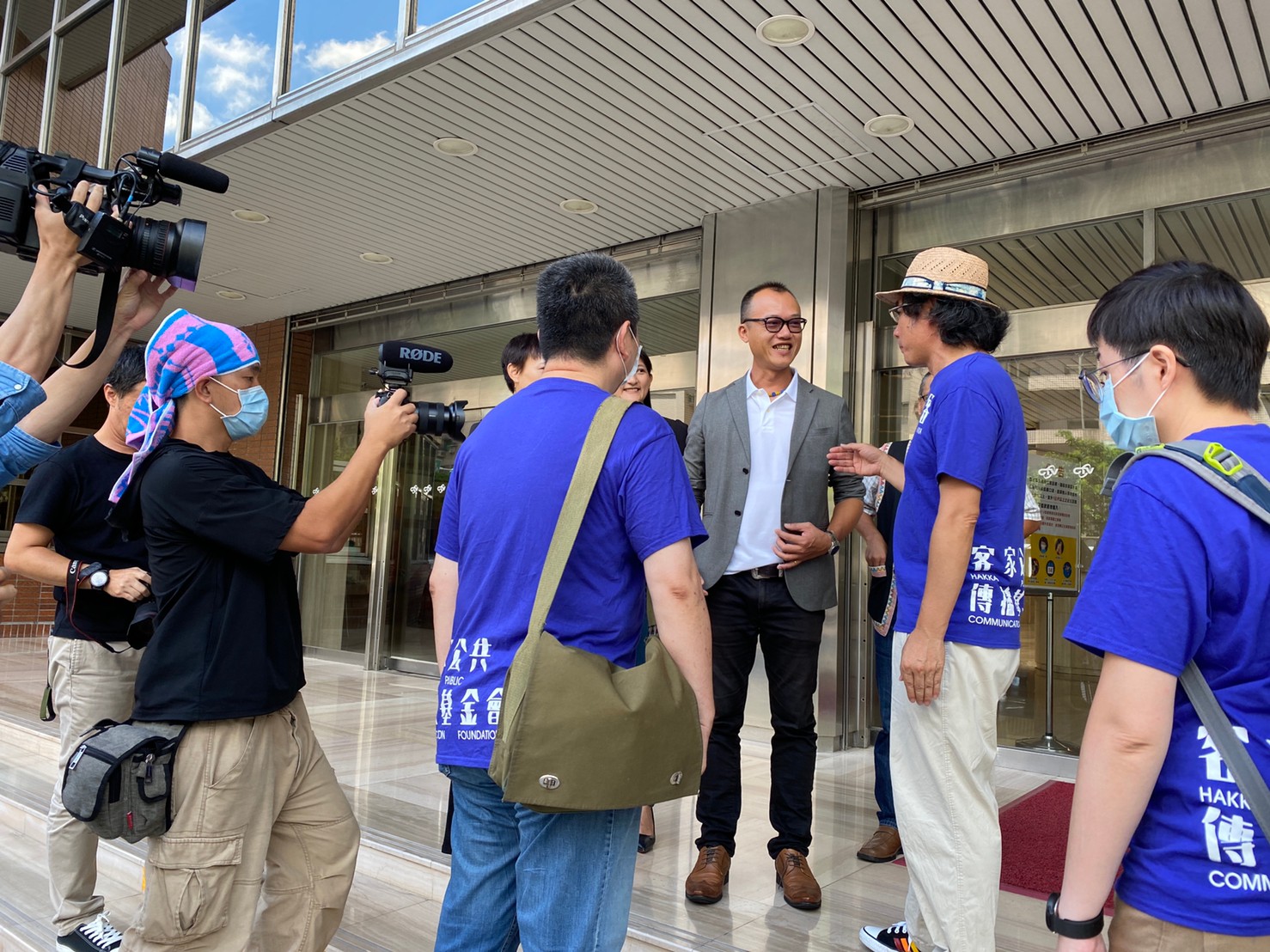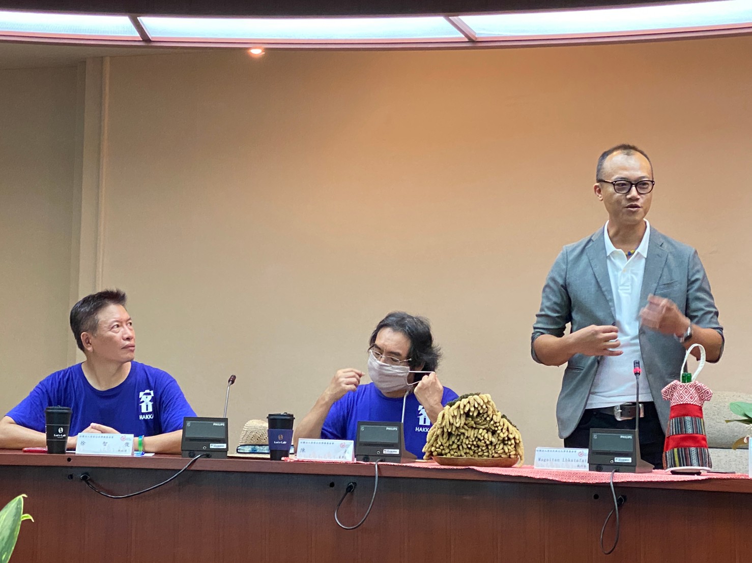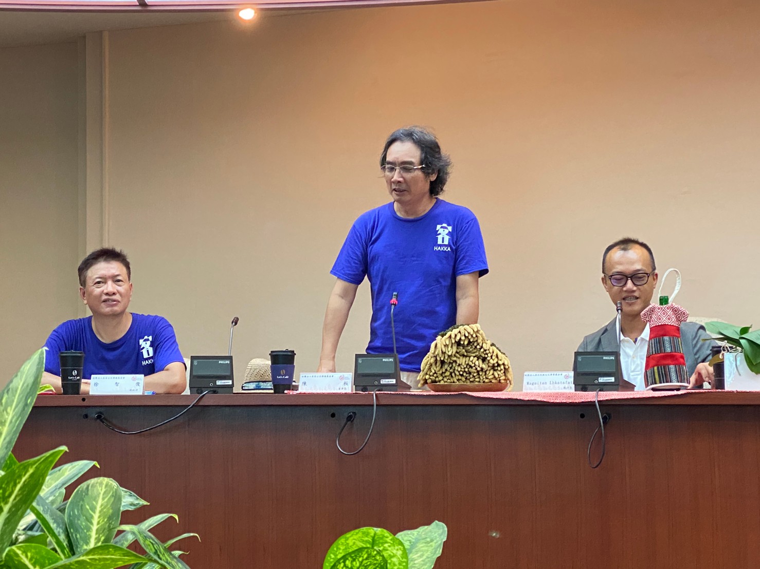 今日一早,原住民族文化事業基金會執行長Magaitan Lhkatafatu(瑪蓋丹)率領原文會所屬的原住民族電視台及Alian96.3原住民族廣播電台主管,迎接客家公共傳播基金會全體員工,雙方開心地在講客進鄉團行動直播車前高唱「客家國歌」《客家本色》,緊接著,陳董事長和執行長瑪蓋丹也互贈客家藍染、苗栗客家酸柑茶及原住民黑磁碗盤組,執行長瑪蓋丹更開玩笑地說,今天看到那麼多客家好朋友來到原文會交流,原住民耆老遇到這種熱鬧場合,都會講一個原住民式笑話,就是「今天來了那麼多朋友真是讓我「無地自容」、大家就隨興「咎由自取」吧!」語畢瞬間炒熱了現場氣氛,也讓大家見識到原住民天生熱情幽默的個性。