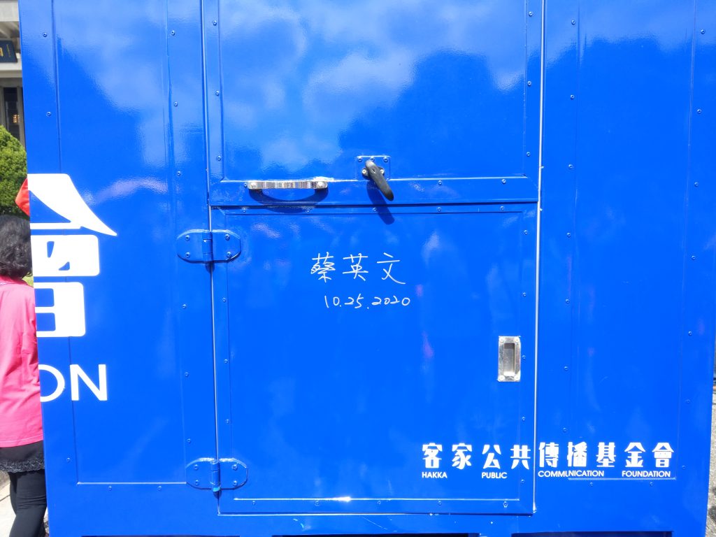 最後,主祭大典圓滿禮成後,楊主委及客家公共傳播基金會董事長陳邦畛陪同蔡總統,特別走向客家公共傳播基金會的講客進鄉團直播行動車,蔡總統親自在車身外簽名,希望講客進鄉團直播行動車能帶著國人對客家傳播的期望,以新媒體匯流技術,深入全國369客庄,讓更多人看見全新的客家美好,客家公共傳播基金會陳董事長承諾,客家公共傳播金會將運用新媒體技術結合傳統媒介,提升客家鄉親的媒體近用權,戮力公私合作推動客家邁向主流。