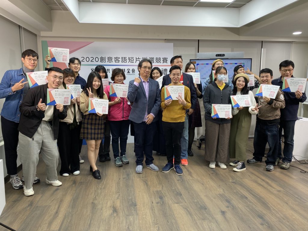 今日的首屆「2020創意客語短片徵選競賽」頒獎典禮,由客家公共傳播基金會董事長陳邦畛及總經理徐智俊頒發獎金及獎狀予得獎者,首獎由財團法人寶島客家廣播電台李穎珍、陳佾玄、賴尚群、張靖玄、陳怡廷、林莉羚的作品《來點客流感》奪得獎金20萬元;貳獎由黃維婷、吳添運、黃裕庭的作品《阿公禾埕的月光》獲得獎金10萬元;參獎由徐仁清、張家瑄、李亭儀、王韻萍、林佳臻的作品《搶救龍珠大作戰》獲得獎金5萬元;佳作則由李舒蓉、林君蓉、劉宇倫、邱渝凱、曾志勇《人客來坐,You’re more than welcome!》;陳海旭《新版客家本色》;劉富丞、黃意恩、曾怡彬《說客日》;張雲凱《控窯的記憶》;賴韋勳、吳品萱《妝水水zongˊ suiˋsuiˋ》以上5名佳作各獲得獎金1萬元;入圍作品及網路人氣獎同時由許傳焉的《2020疫情後失智阿嬤微笑吃……雞!》共獲得1萬元。
