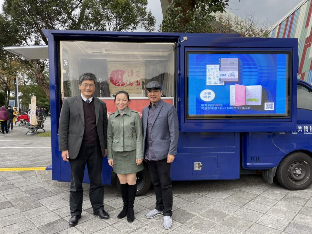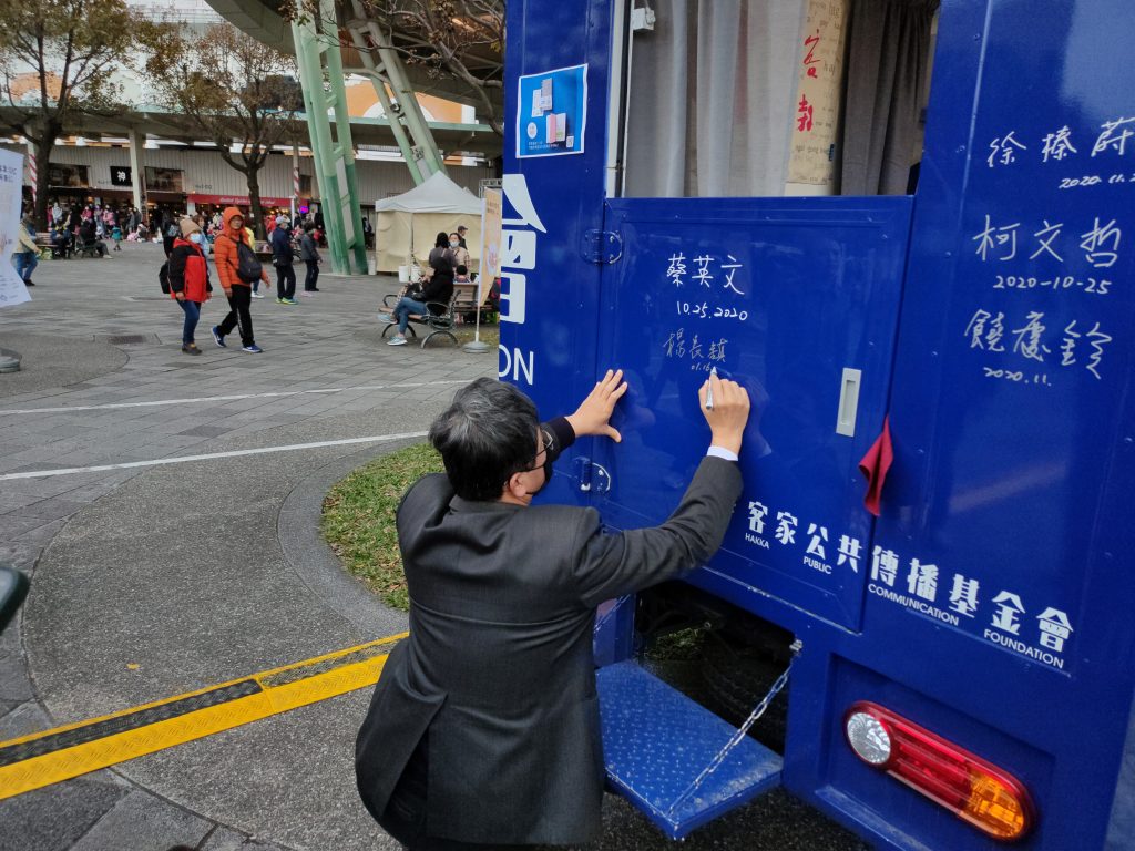 客委會楊主委在客家公共傳播基金會的「講客號」直播行動車車身簽名,送上祝福。