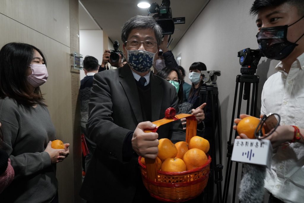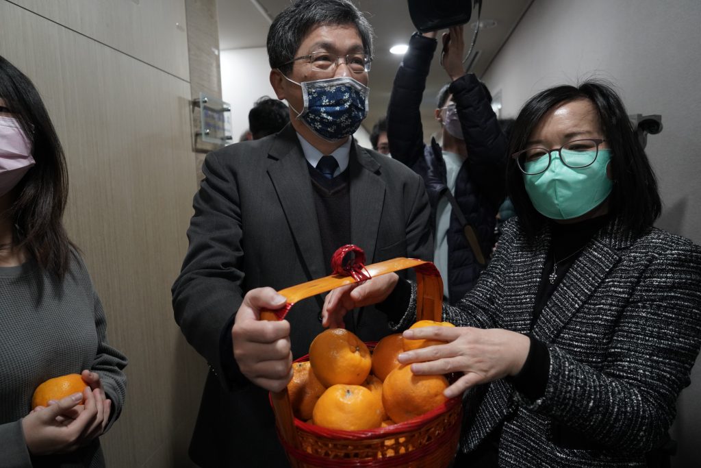 揭牌儀式後,客委會主委楊長鎮向同仁發送橘子,祝福同仁大吉大利、業務推動順利。