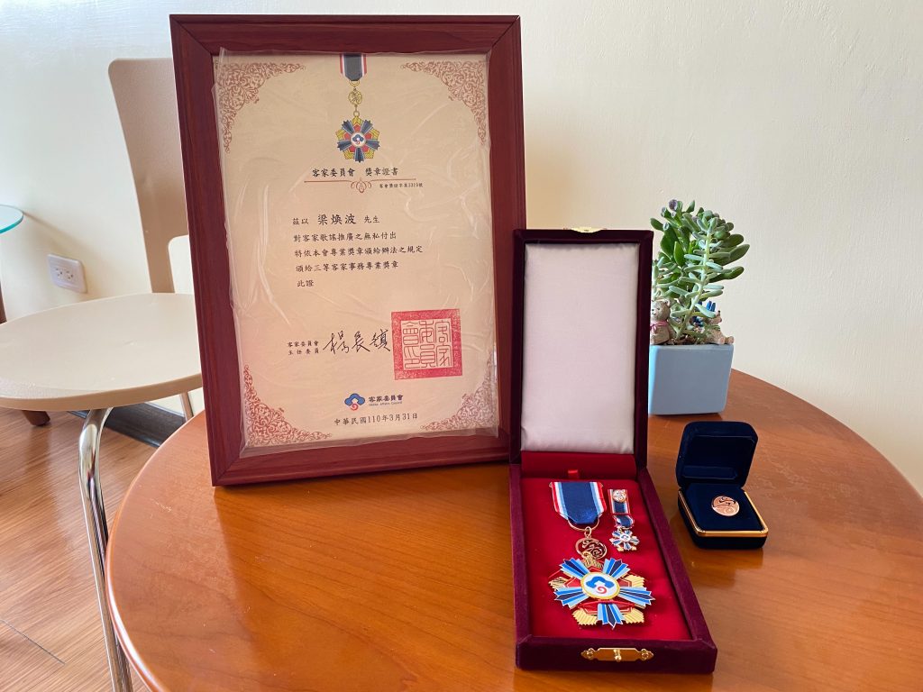 客家委員會副主任委員范佐銘今(16)日,代表客委會主委楊長鎮前往桃園市桃園區,頒發三等客家事務專業獎予梁煥波,范副主委感謝梁老師一生無私推廣客家歌謠,不僅致力將優美的客家音樂讓客家人聽見,更吸引到許多非客家族群的喜愛,梁老師獲頒三等客家事務專業獎章實至名歸。