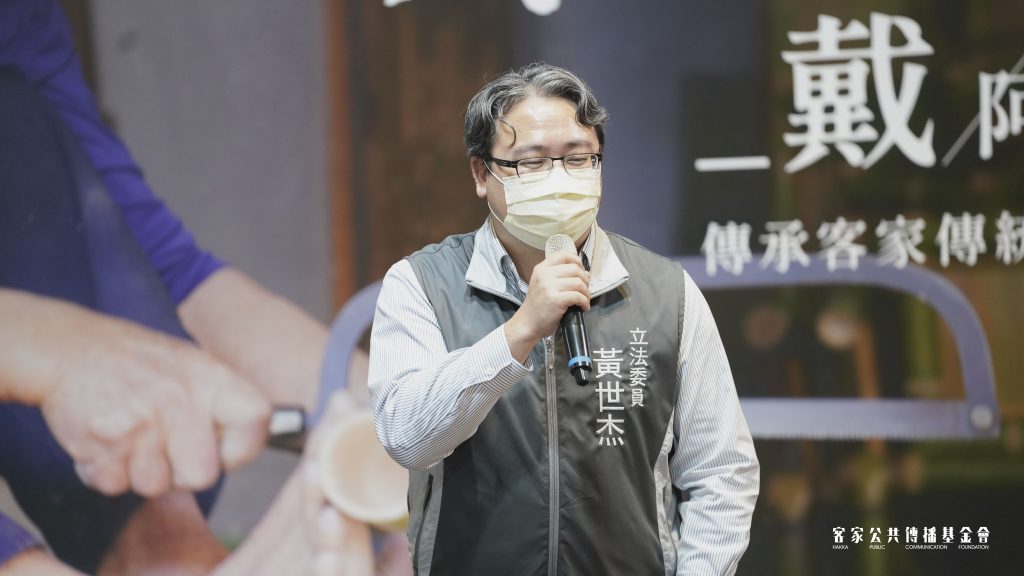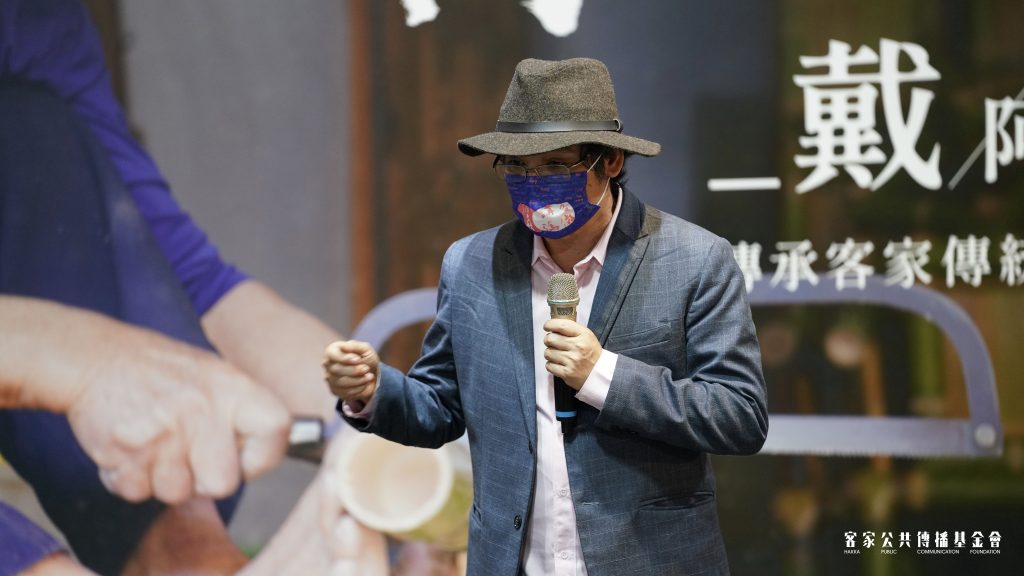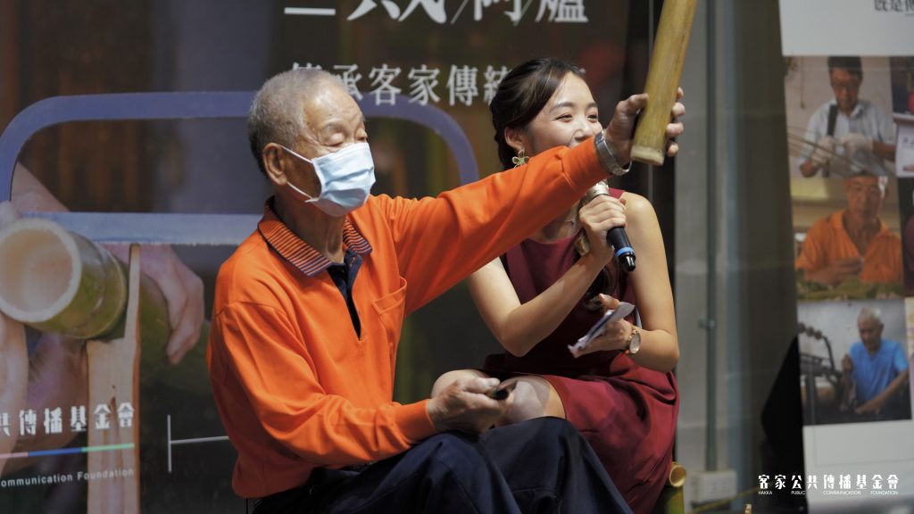 今日的《傳.傳》系列短片影集首映會,客家委員會藝文傳播處處長廖美玲、立法委員黃世杰及眾多楊梅富岡鄉親蒞臨現場支持,同時,邀請到系列影集第一集的楊梅富岡國寶竹藝大師戴阿爐,現場示範集逾70年竹子工藝於一身的技巧,首映會臺上的戴阿伯熟練地用腳固定竹子,手拿工具刨竹子,空氣中瞬間揚起竹屑,不到一分鐘完成了一件精美竹錢筒,就在大家嘖嘖稱奇時,也明白國寶竹藝大師的稱號絕非浪得虛名。