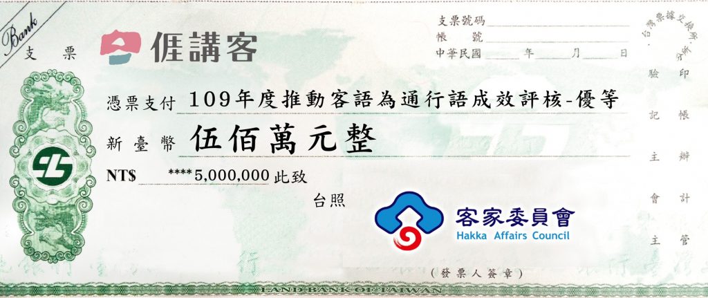 客委會為鼓勵地方政府推動客語為通行語,營造友善客語環境,每年針對推動成效績優單位,給予獎勵。苗栗縣為客家大縣,客家人口占64.3%,已連續2年蟬聯推動客語為通行語成效第1名。109年度除縣府獲「優等」獎項外,另有三義鄉、頭屋鄉、苗栗市、公館鄉及造橋鄉等12個鄉鎮市,分別獲得優等或佳等,彰顯客家語言在苗栗當地十分普及。