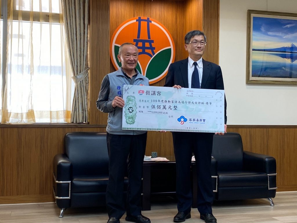 客家委員會日前公布109年度推動客語為通行語評核結果,苗栗縣獲得「優等」殊榮,客委會主任委員楊長鎮今(11)日前往苗栗縣政府向縣長徐耀昌道賀並頒發獎金500萬元,針對本土語客語課程、客語成為使用語言與教學語言,以及推動客語為通行語相關措施,與徐縣長進行意見交流與分享。