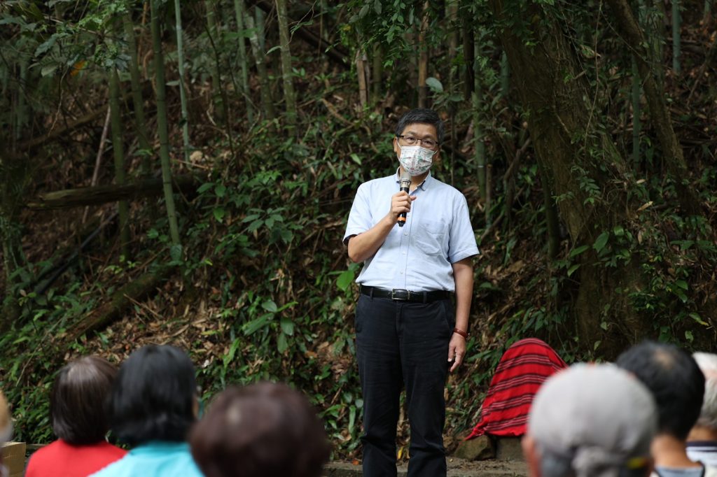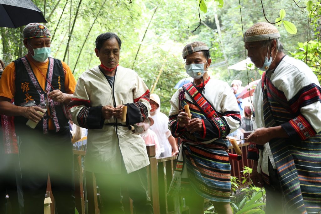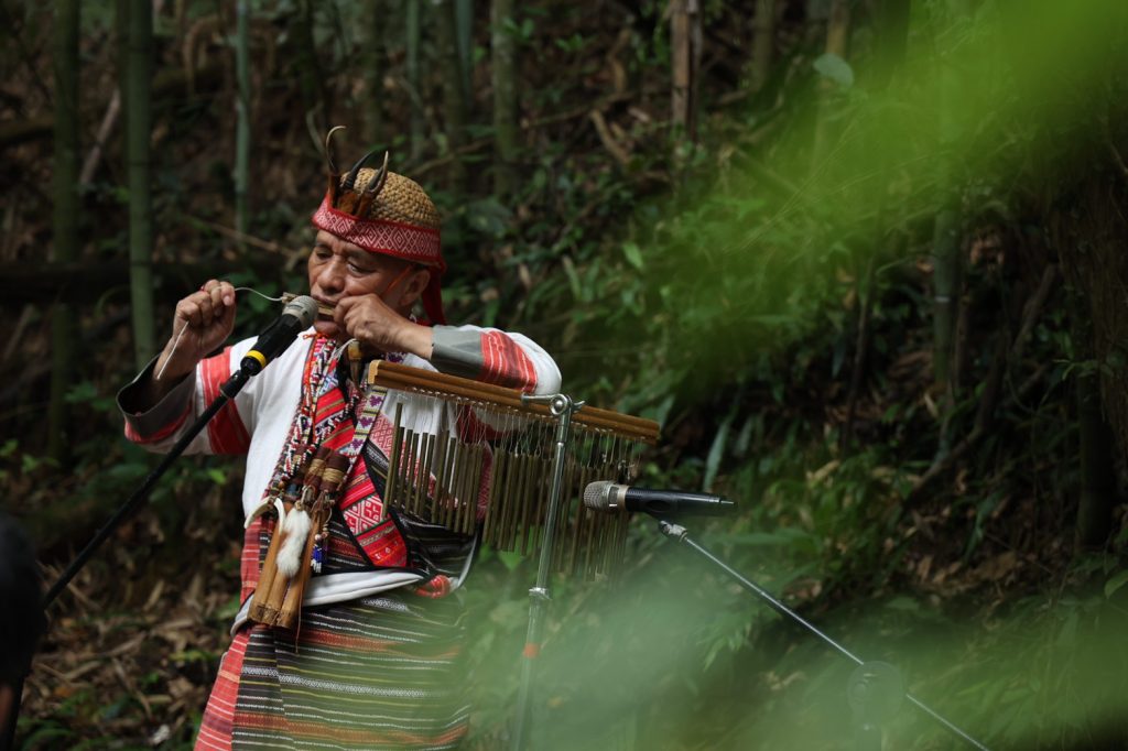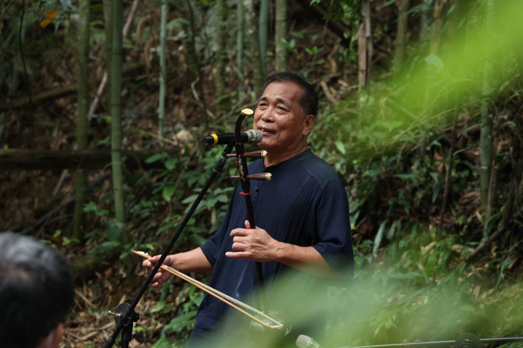 今日的活動,首先由泰雅族歌手梁玉水(多乃)以口簧琴演奏,渾然天成的聲樂與現場竹林產生優美共鳴,緊接著,國寶級大師賴仁政拉二胡演唱客家山歌〈雅悠圳頌〉,為致敬立碑儀式拉開序幕。