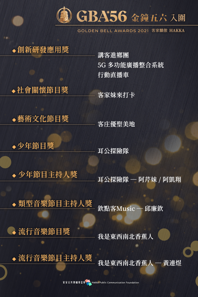今年廣播金鐘獎計有72家業者、856件作品參賽,計有126件作品入圍,將角逐節目獎、個人獎、廣告獎、電臺品牌行銷創新獎、創新研發應用獎等共26個獎項,而客家公共傳播基金會-講客廣播電臺也入圍8大獎項,創下歷年來最佳入圍成績。