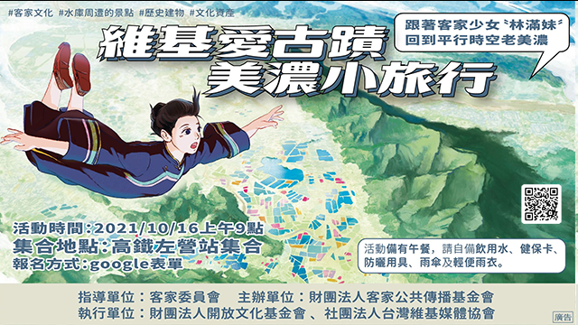 這場走讀,將邀請導覽老師帶領,訴說各個景點背後的有著精采的客家故事,同時,在實際探查過程拍照紀錄,初步了解如何在維基百科、維基導遊等上傳新資料,共同來為客家庄寫歷史說故事。