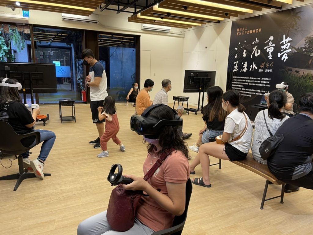 今日VR體驗特展邀請到客家委員會副主任委員鍾孔炤、客傳會董事黃心健、高雄市客家委員會前主委陳志勇、屏東縣政府及六堆各區鄉鎮長等貴賓,蒞臨現場體驗VR互動影片,鍾副主委也當場穿戴VR五感裝置,感受除了像是穿越時空,摸到五溝水、躍上東門樓之外,還能聞到泥土和花香、雨水的味道,十分有趣。緊接著,現場播映劉安明及曾文老師忠的預錄訪談影片,影片中,兩位老師難掩興奮地向大家介紹,自己的作品被轉換成VR的感動。