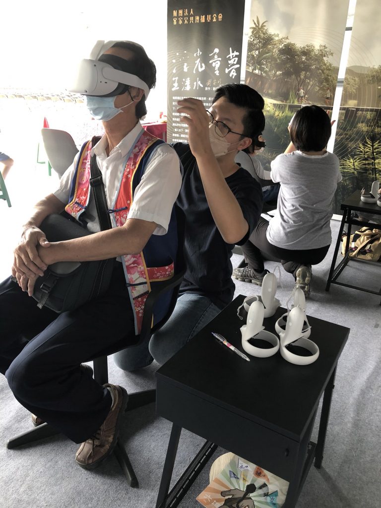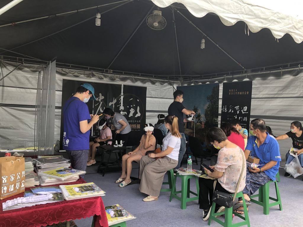 此外,客傳會也在現場設立「六堆300浮光憶彩-VR體驗特展」帳篷區,特別將六堆攝影家劉安明的攝影作品、美濃畫家曾文忠的油畫作品,運用虛擬實境(Virtual Reality, VR)新媒體技術,將平面轉製成VR互動體驗影片,許多鄉親及小朋友體驗時,都被VR影片的真實感驚豔!還有小朋友體驗時,不斷用客語和VR互動,十分可愛!