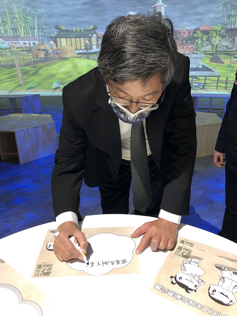 客家委員會楊長鎮主委參觀乙未保台紀念公園內的記憶展示廳,體驗互動設計,寫下祝福的話。