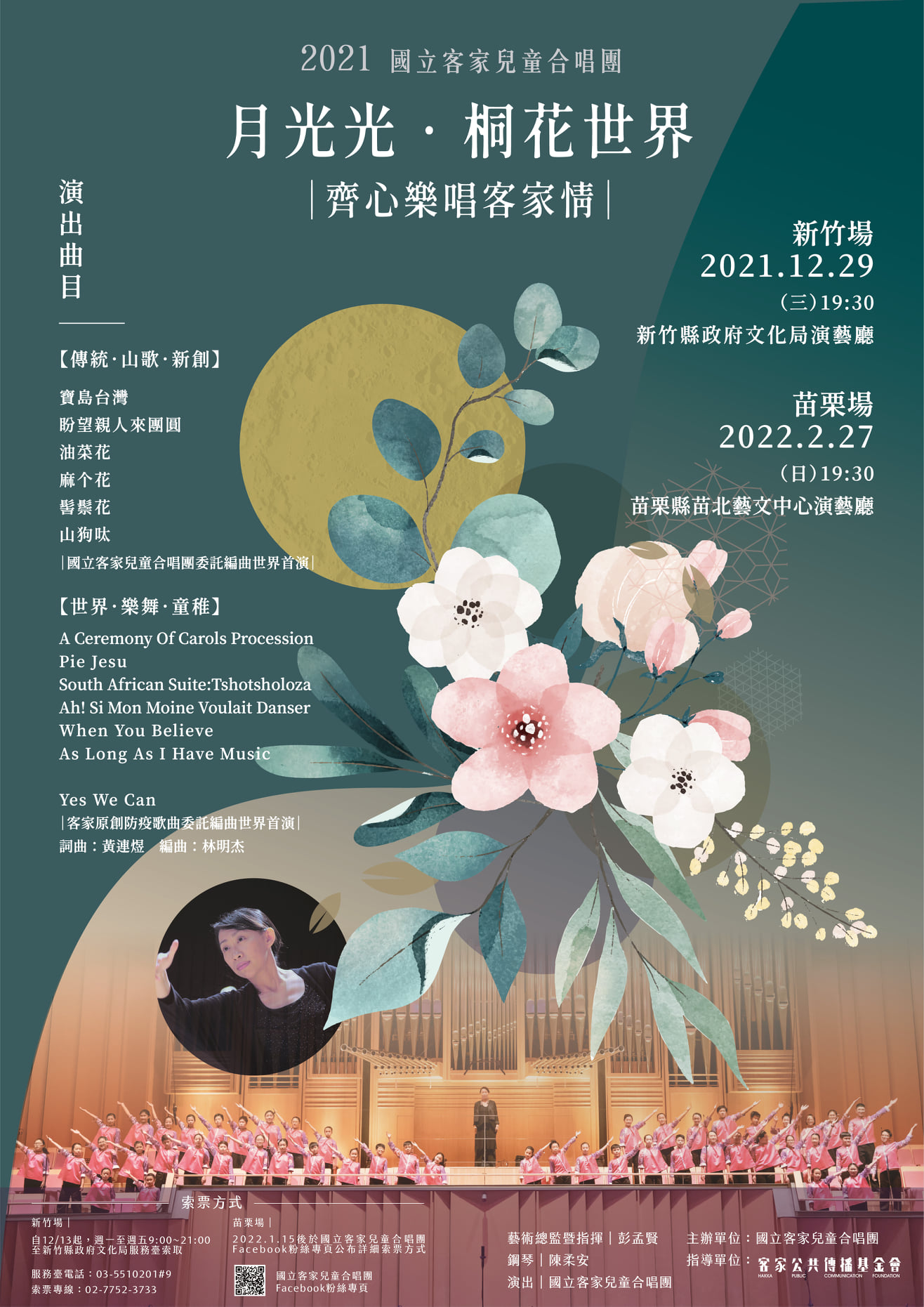 我國唯一的國立兒童合唱團「國立客家兒童合唱團」,今(29)日晚間,在新竹縣政府文化局演藝廳,登臺演唱歲末音樂會《月光光・桐花世界 齊心樂唱客家情》,小朋友們在世界級指揮家、團長彭孟賢老師帶領下,以及鋼琴家陳柔安的伴奏聲中,一連演唱14首客語及西洋名曲,悠揚稚嫩的童聲,搭配訓練多時的各部合唱技巧,讓全場陶醉,客家公共傳播基金會董事長陳邦畛表示,感謝今晚國立客家兒童合唱團美好的演出,希望透過客家音樂,能在2021年歲末之際,為2022年的臺灣,注入滿滿的能量及祝福。