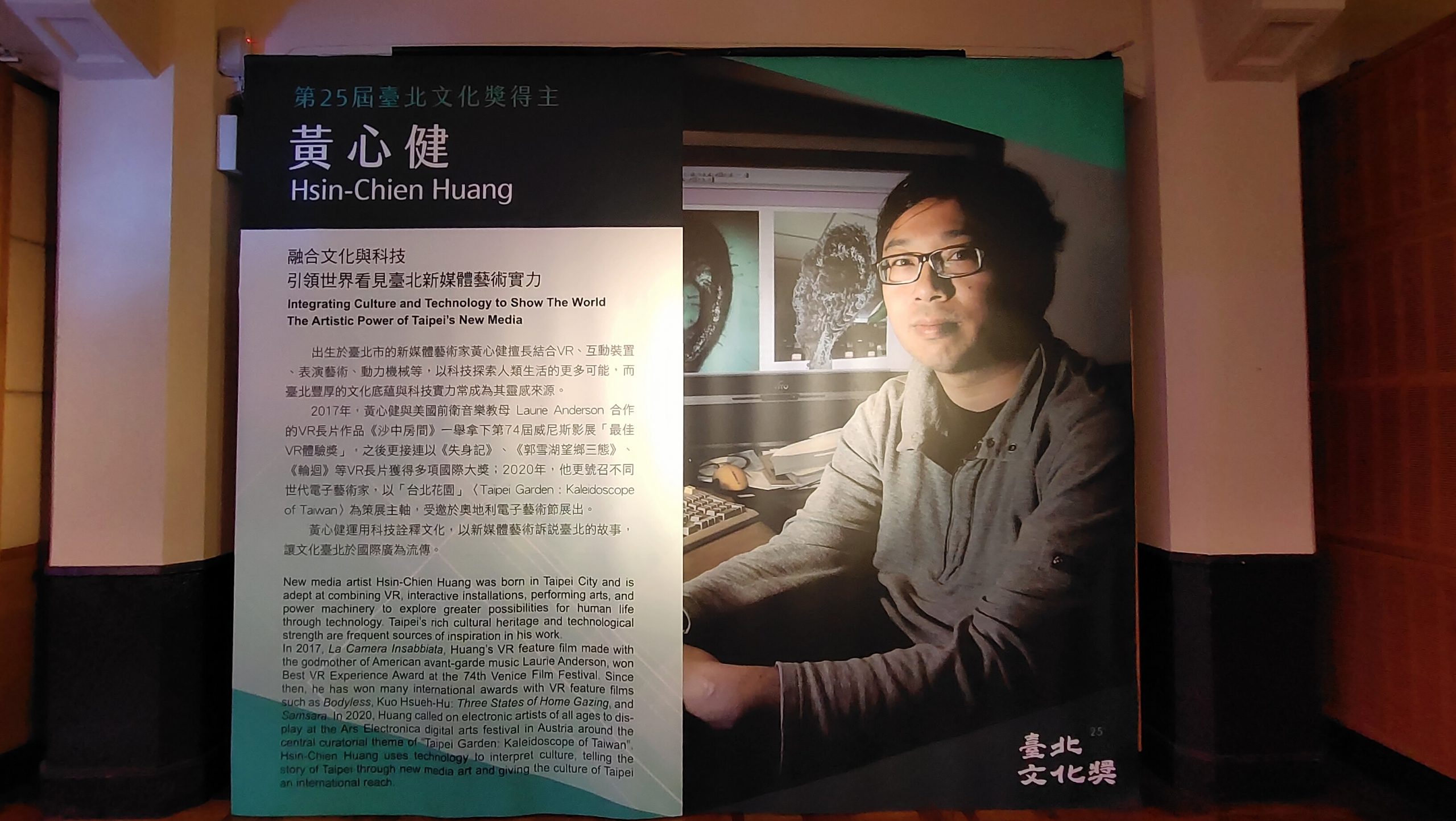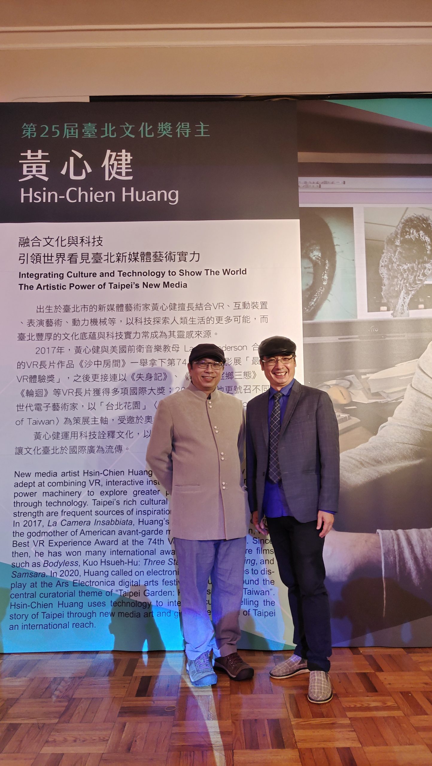 第25屆臺北文化獎頒獎典禮,於今(26)日下午在臺北市中山堂光復廳盛大舉辦,臺北市長柯文哲頒獎予四位得主,分別是文學構築臺北人文薈萃文化記憶的文壇巨擘白先勇、引領世界看見臺北新媒體藝術實力的藝術家黃心健、打造藝術家國際交流平臺並提攜無數後輩的蕭麗虹,以及為臺北開啟接軌國際之路的英語教育先驅彭蒙惠。典禮上,這次得獎者之一,同時也是客家公共傳播基金會董事的黃心健,公開宣布將這筆獎金贈予客傳會,期望加速客傳會發展客家VR新媒體技術,讓客家邁向全新領域「客家元宇宙」!