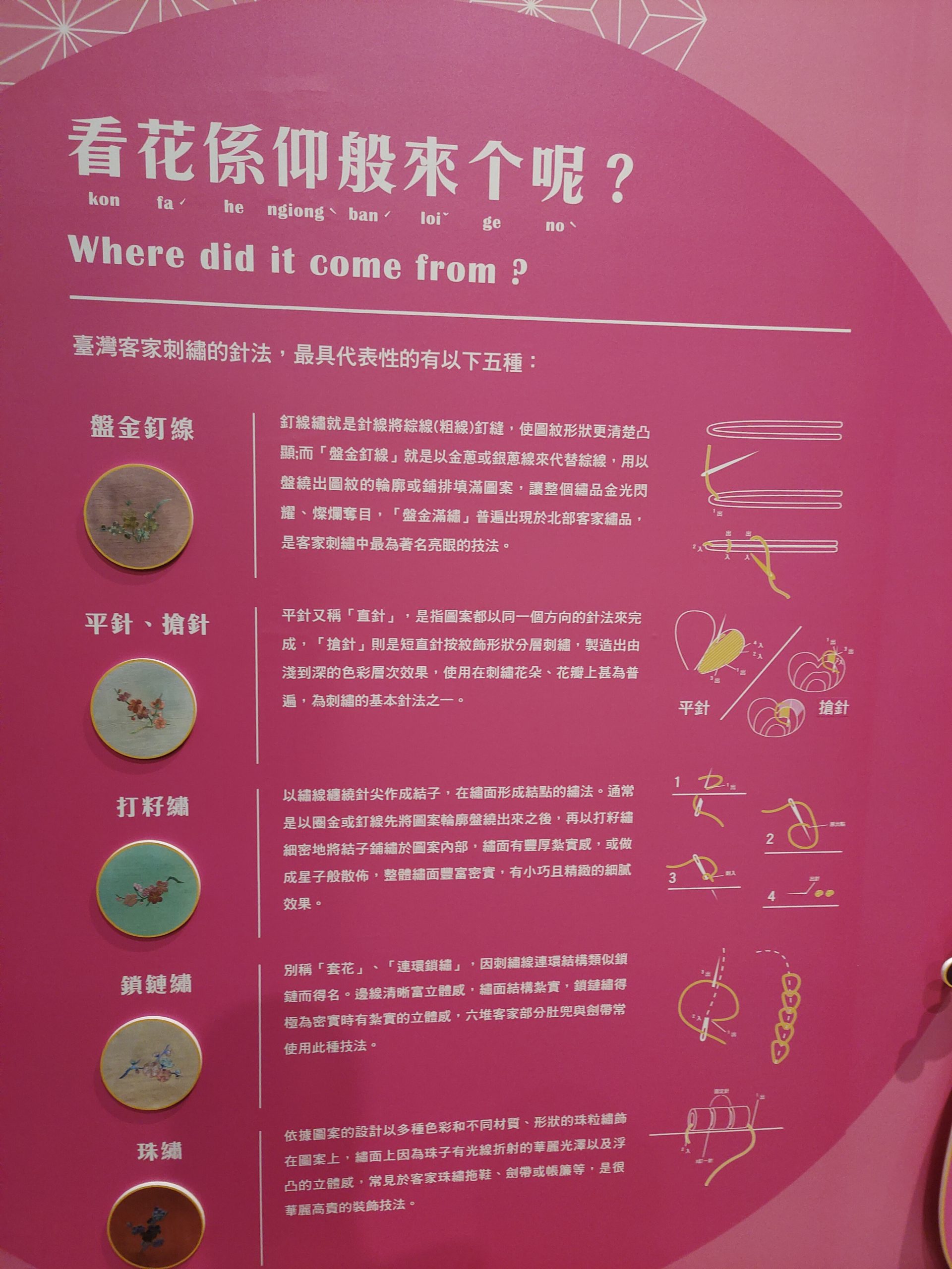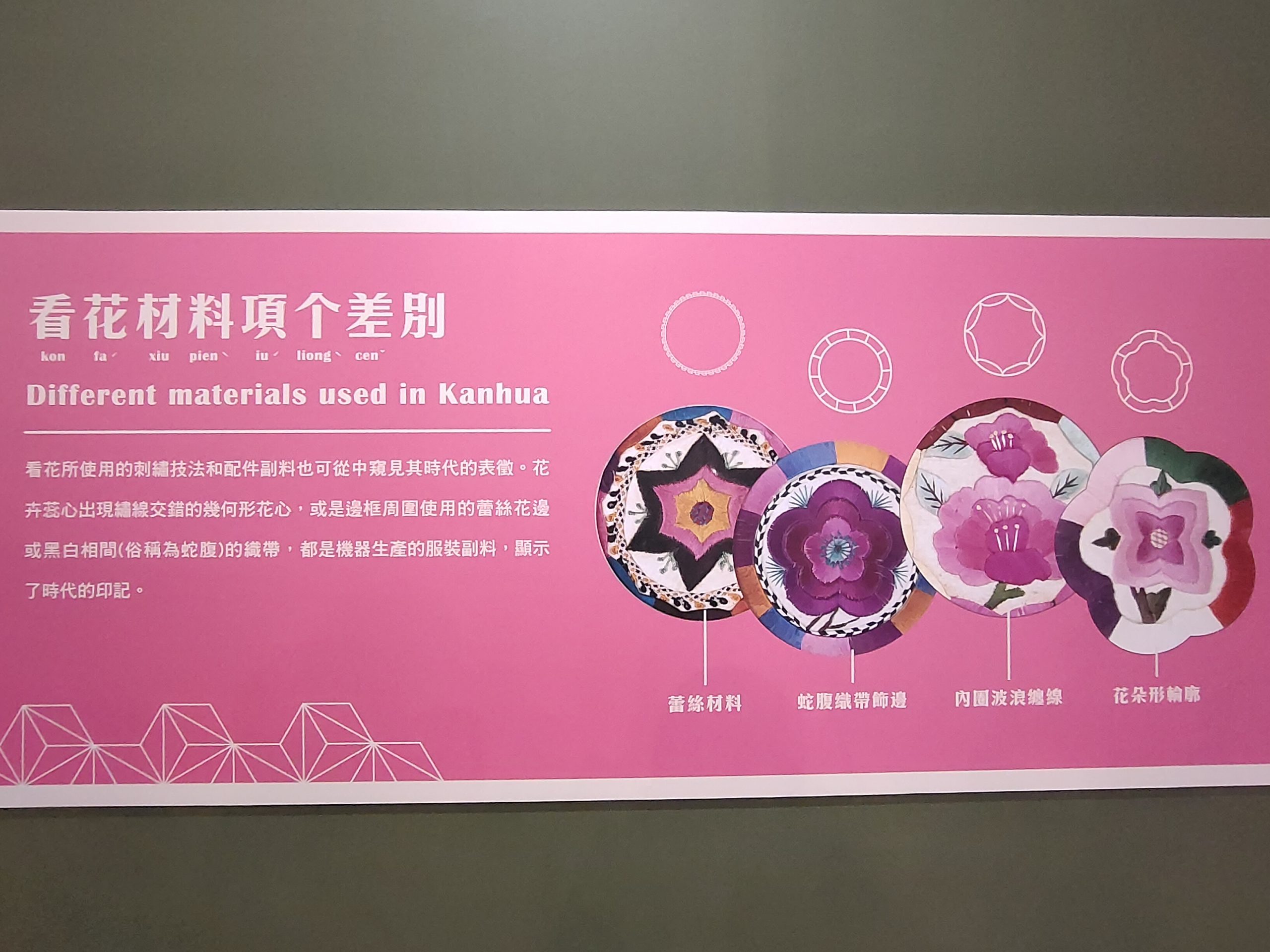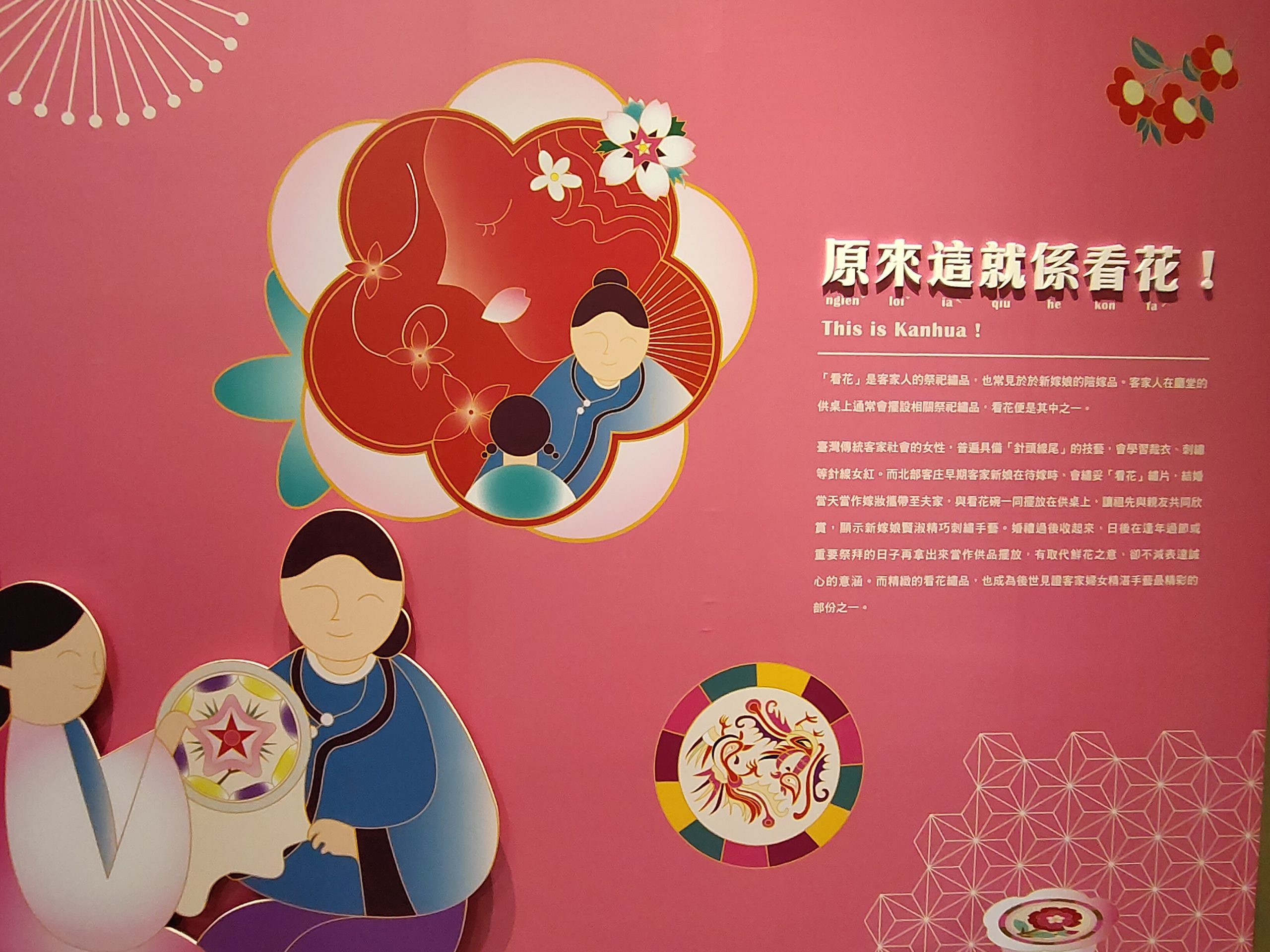客家文化發展中心何主任表示,國立歷史博物館廖館長於109年8月率隊拜訪客發中心,並參與「川流不息–臺灣客家與日本國際展」暨「典藏客家-經典館藏常設展」開幕後,雙方接續合作「花與花─客家看花與盤花特展」,以史博館典藏的客家看花藏品為主軸,搭配實踐大學鄭惠美副教授、收藏家洪敦光先生、陳盛增先生、陳達明先生、王嘉靖先生與新北市政府客家事務局藏品共同策劃展出,試圖從精巧卻繁複的刺繡工藝,一探清代中晚期及日本時期代表臺灣北部客家文化特色─「看花」,同時展出南部六堆客庄供奉神明時的特有文化─「盤花」,並邀請屏東科技大學李梁淑副教授與六堆在地文史專家林竹貞老師講述六堆盤花文化代表著客家對於祭祀禮節崇敬的心意,藉由探索不同面向的客家文化,展現出客家文化兼容並蓄的可貴;何主任透露,該展提前在今(111)年農曆年前開展,就是希望能讓民眾在農曆年節前,搶先到館觀賞浪漫的花,過個好年。