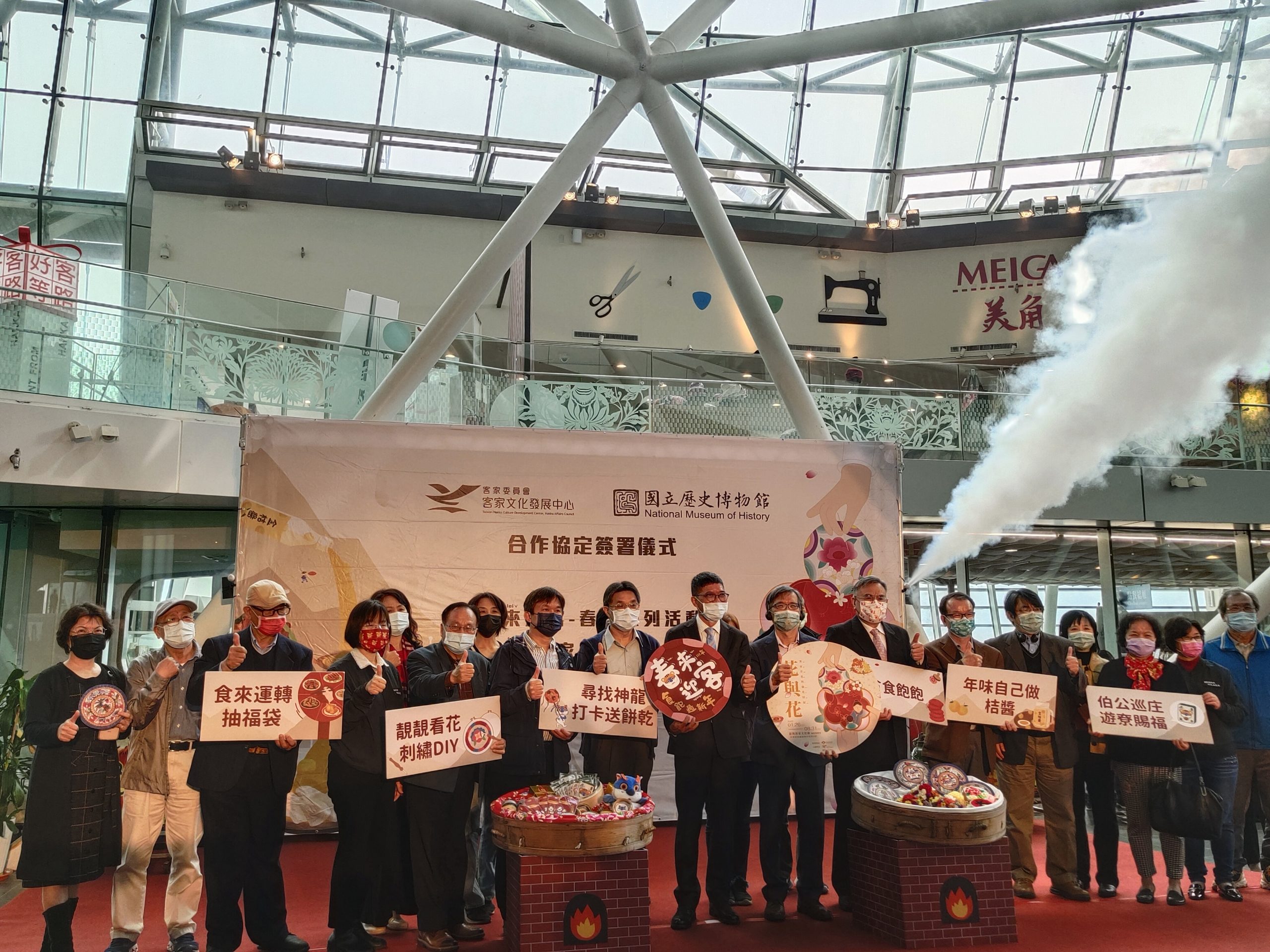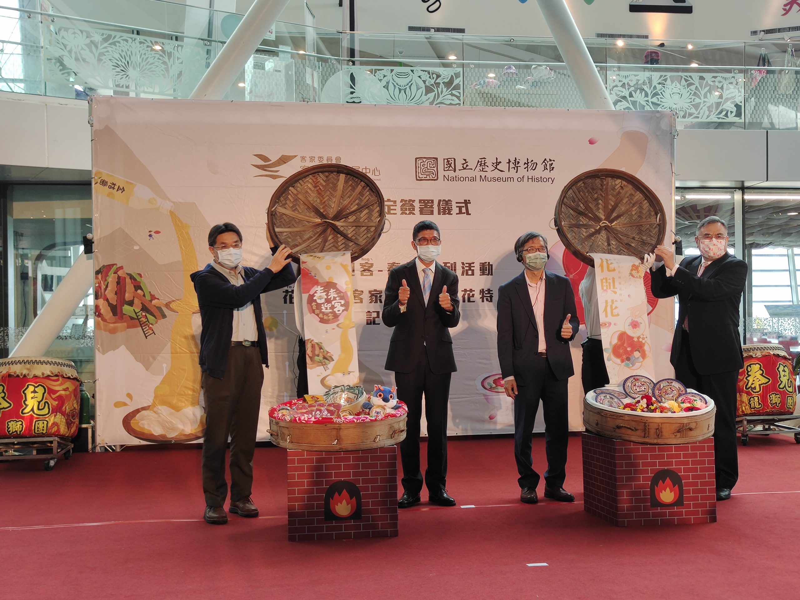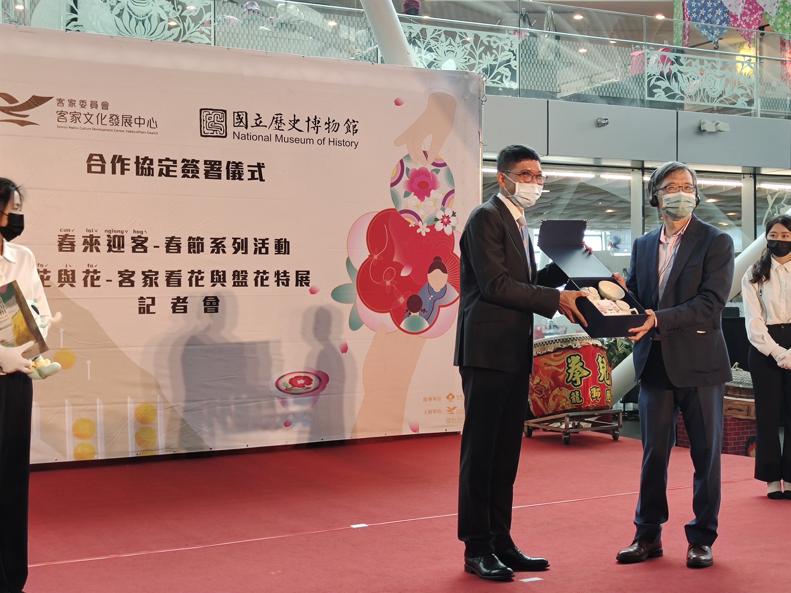 今日的雙方簽署儀式,國立歷史博物館館長廖新田與客發中心主任何金樑開心地互贈禮物,同時,這也是史博館廖館長於2月1日歸建前的最後一次簽署合作活動,因此史博館廖館長非常重視這次的「花與花─客家看花與盤花特展」就是希望能將雙方最珍貴的客家花卉藝術文物、史料,呈現給大家,也希望未來雙方能夠更密切的合作、交流。