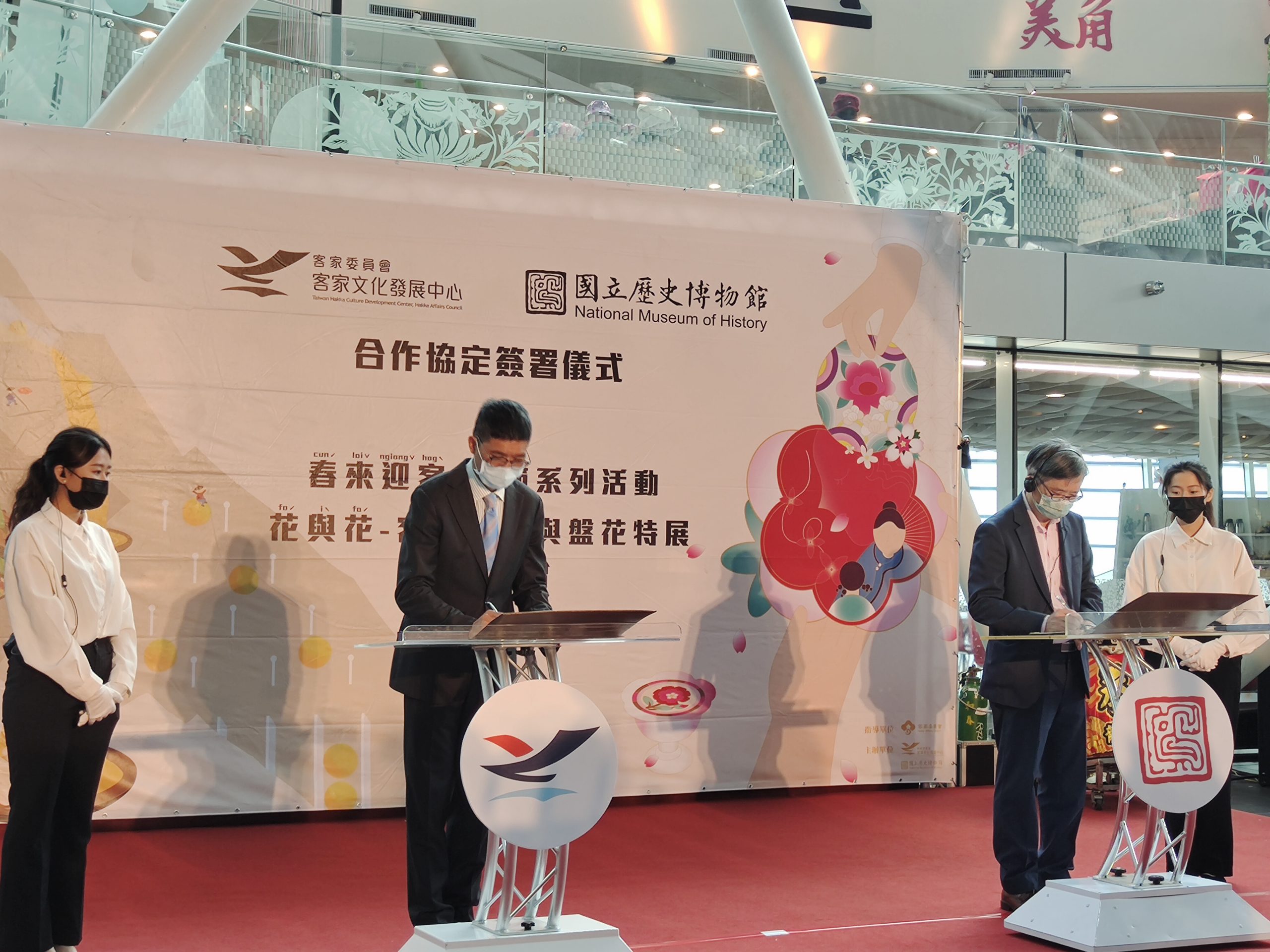 客家文化發展中心與國立歷史博物館首度聯手策展「花與花─客家看花與盤花特展」,並於今(26)日於苗栗銅鑼的臺灣客家文化館舉辦合作簽署儀式,客發中心主任何金樑與國立歷史博物館館長廖新田,雙方共同簽屬6年合作協定,客發中心何主任熱情邀請大家,農曆佳節前,可以搶先來臺灣客家文化館,一窺雙方合作展出的珍貴館藏文物和史料,體驗客家人愛花的日常浪漫!