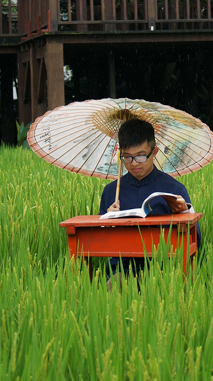 臺北市客家文化基金會還有特別規劃,放在田中央的畫心書桌,大家一起坐在田中央,聽大自然的蟲鳴交響曲。圖片/臺北市客委會提供