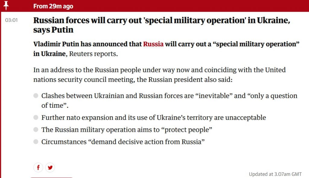 目前已知俄羅斯軍隊的特種軍事行動地點將是烏克蘭的 Donbas 地區。普亭甚至要求,烏克蘭東部士兵應該要立即放下他們的武器,並且回家。他並指責美國與它的盟友們,忽略了俄羅斯反對烏克蘭加入北約組織以及西方國家應對莫斯科提供安全保證等訴求。雖然俄羅斯軍隊沒有佔領烏克蘭的計劃,但戰火已經展開。而聯合國安理會 8974 號會議中,也熱烈在討論烏克蘭危機問題。