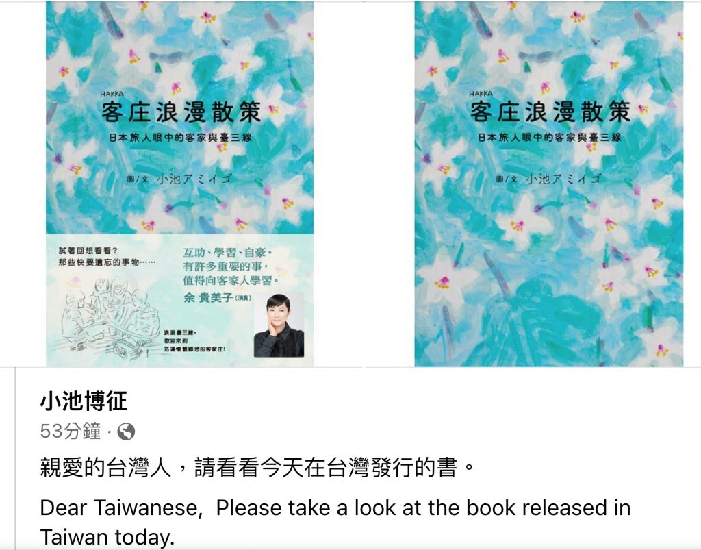 【客傳會 / 綜合報導】由日本知名小池博征駐村繪製的的「台湾客家スケッチブック」《客庄浪漫散策》今天在臺灣、日本正是出版!小池博征今天一早就以中、英、日文在臉書上寫下他的心情,他說,他可透過此書表達他在旅行中感受到的客家之美,並且感謝在旅途中所有照顧他的人,「我愛台灣,我愛客家!」