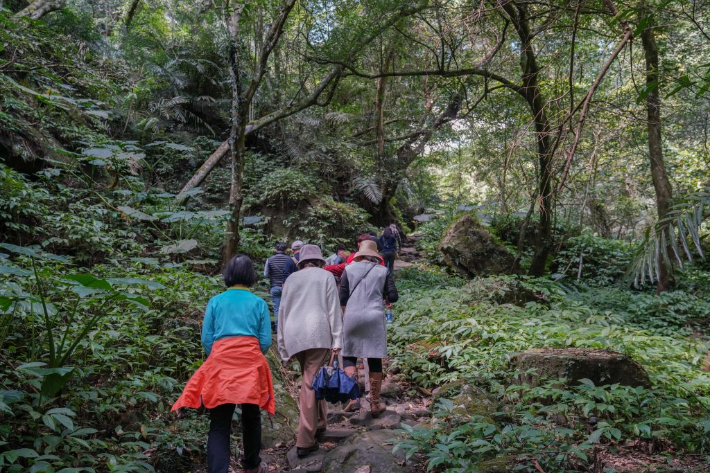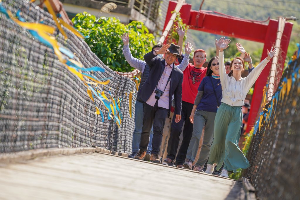 記者會結束後,陳明珠立刻換下禮服換上輕便的休閒服,帶著陳邦畛、苗栗縣政府文化觀光局長林彥甫及在地生態文史工作者、步道志工等人上山,一行人一起走過吊橋,體驗步道周邊山水景緻。