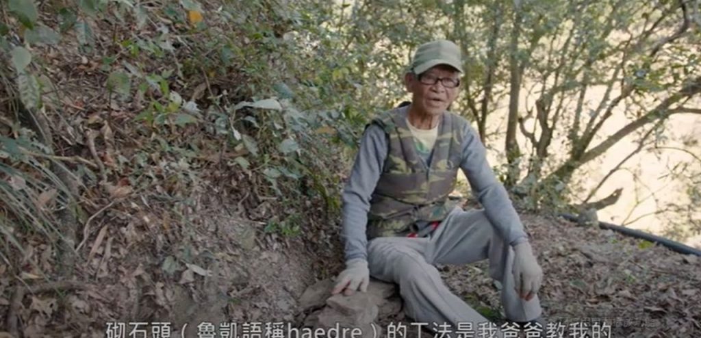 現年87歲的禹弘仁師傅從小沉浸在中央山脈南段、由大量頁岩板岩交疊而成的環境中,他跟隨父兄耳濡目染,傳習魯凱族獨特的石板工藝;從搭建自己的石板屋,乃至與族人換工從而精進砌石技法(haedre),成為部落頂尖的能工巧匠。走在通往舊大武部落的獵人古道,這段禹弘仁從小就熟悉、記憶中族人耕作狩獵的路徑上,有著他平時隨手維護的痕跡,也有帶領部落年輕族人學習傳統工法的身影。