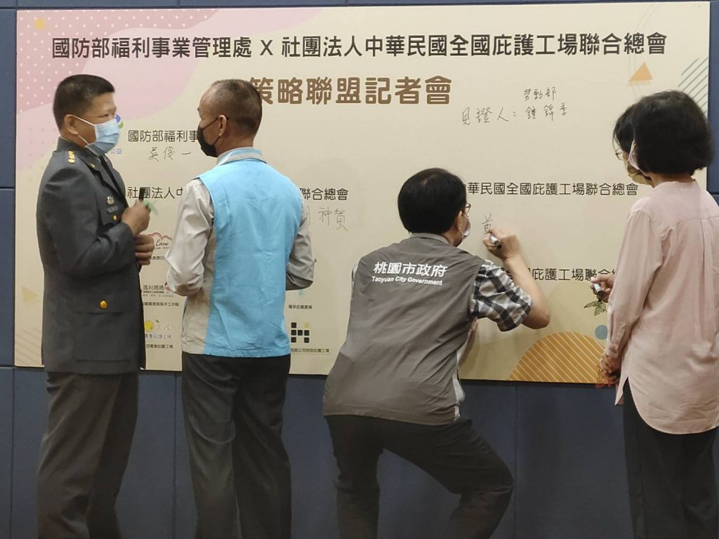 今日的簽約記者會,在立法委員湯蕙禎力促之下,國防部福利事業管理處處長吳俊一上校與社團法人中華民國全國庇護工場聯合總會總會長胡神賀,順利完成策略聯盟計畫簽訂儀式,現場並由桃園市政府勞動局局長吳宏國、勞動力發展署副署長鍾錦季、貴賓們及12家庇護工場店主,一起觀禮見證。