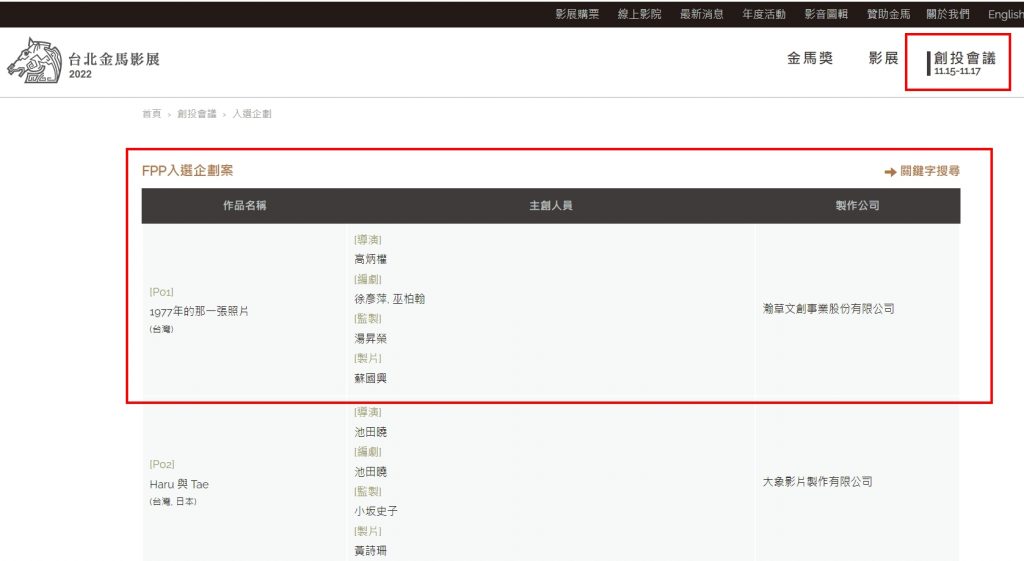 金馬創投9/23公布入選電影企劃,客語電影「1977年的那一張照片」劇本成功獲選。翻攝自金馬創投入選名單