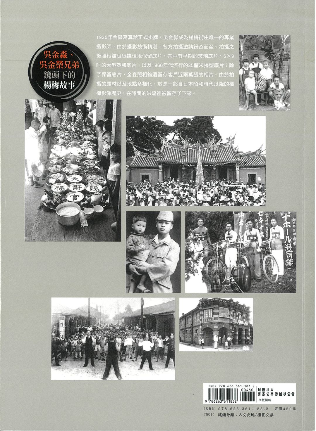 本書精選吳金淼及吳金榮橫跨日治到國民政府的紀實影像,包含戶外集體合照、沙龍照、地方仕紳、家族照、伯公山人物寫真、錫福宮慶典、掛紙及出山還山生命禮俗等主題,透過金淼寫真館的黑白攝影作品,拼寫出一部屬於楊梅的影像史。