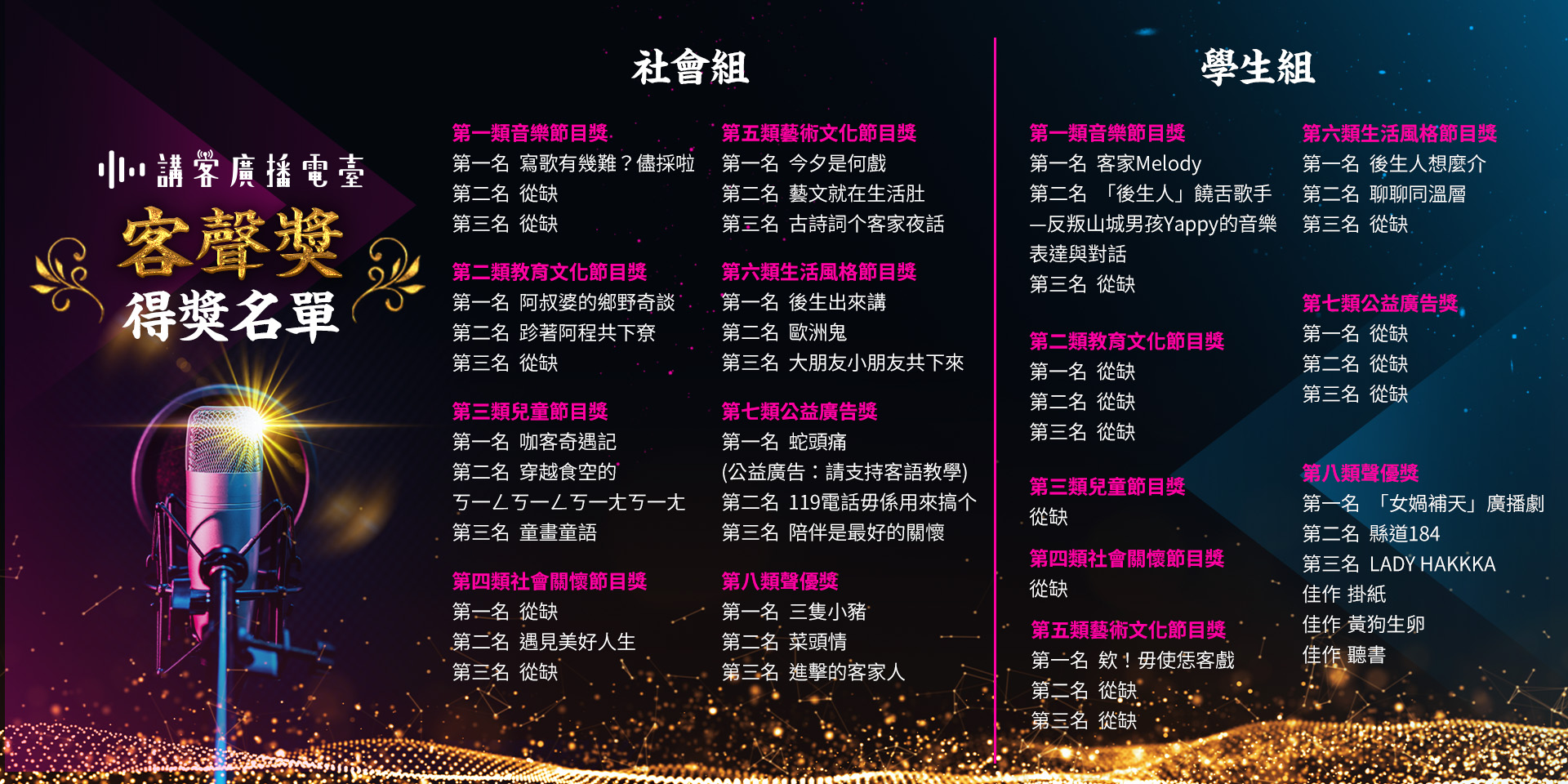 客聲獎入圍名單已經於(111)年7月21日(四)公布,本臺也於頒奬前公布了本次入圍名單的作品專區,歡迎公眾觀摩點閱。