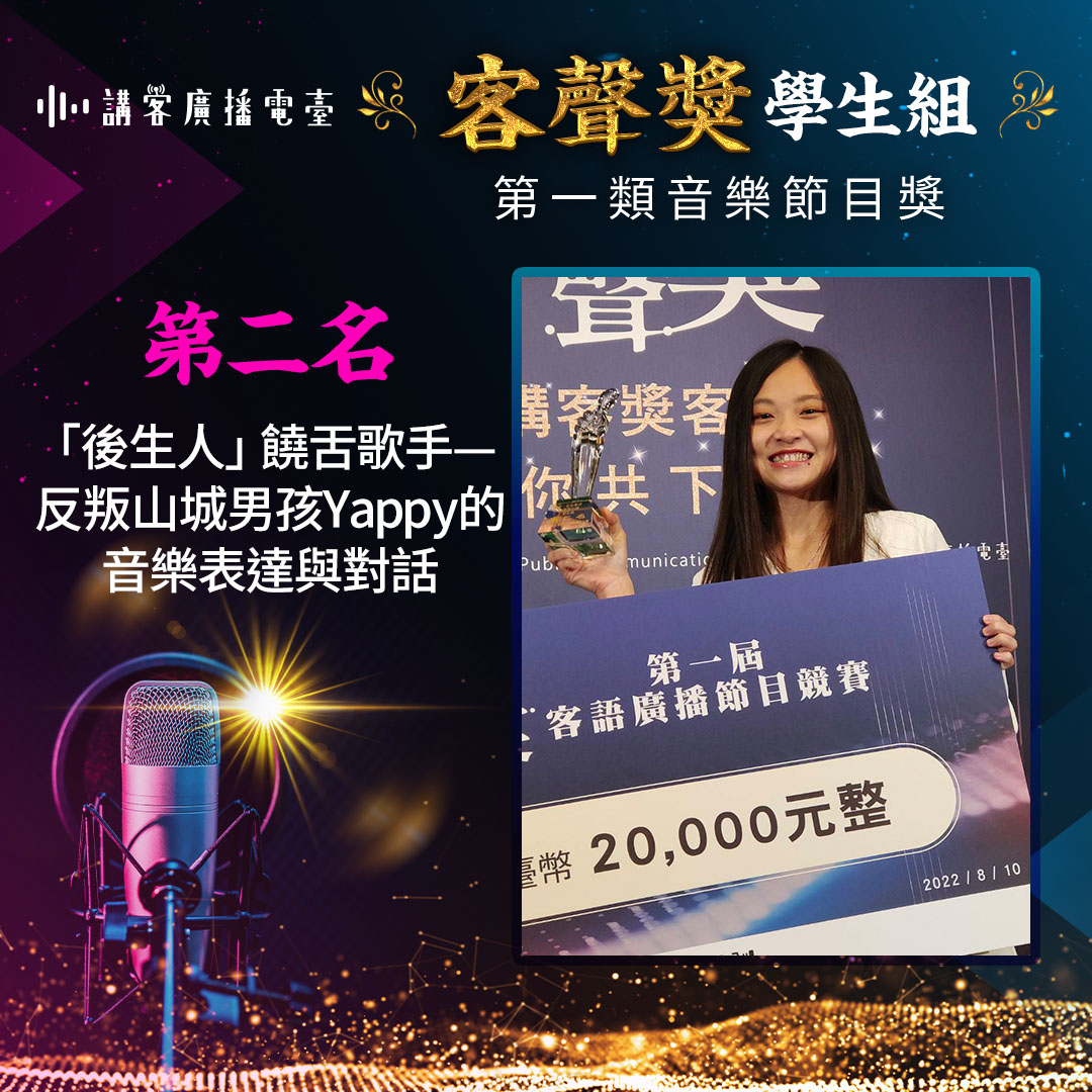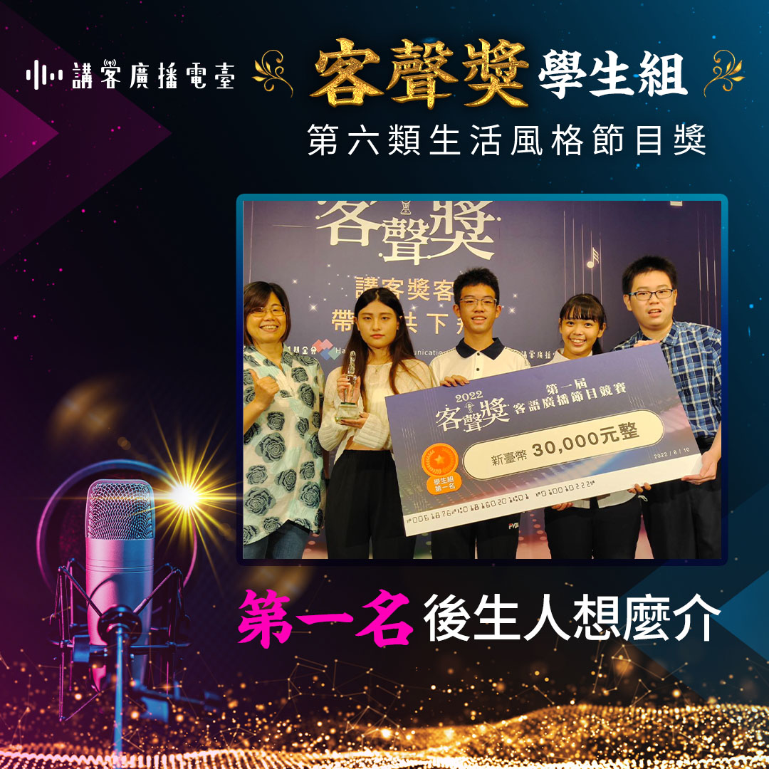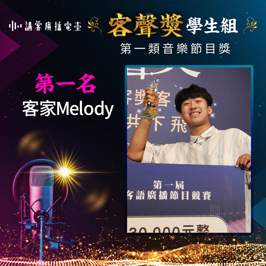 二、學生組各獎項入圍作品以9件為原則,每件各頒獎狀1紙及獎金2仟元;再從入圍作品中選出得獎作品,學生組各獎項第一名頒「客聲獎」獎座1座及獎金3萬元;第二名頒「客聲獎」獎座1座及獎金2萬元;第三名頒「客聲獎」獎座1座及獎金1萬元;佳作3名,各頒獎狀1紙及獎金5仟元。